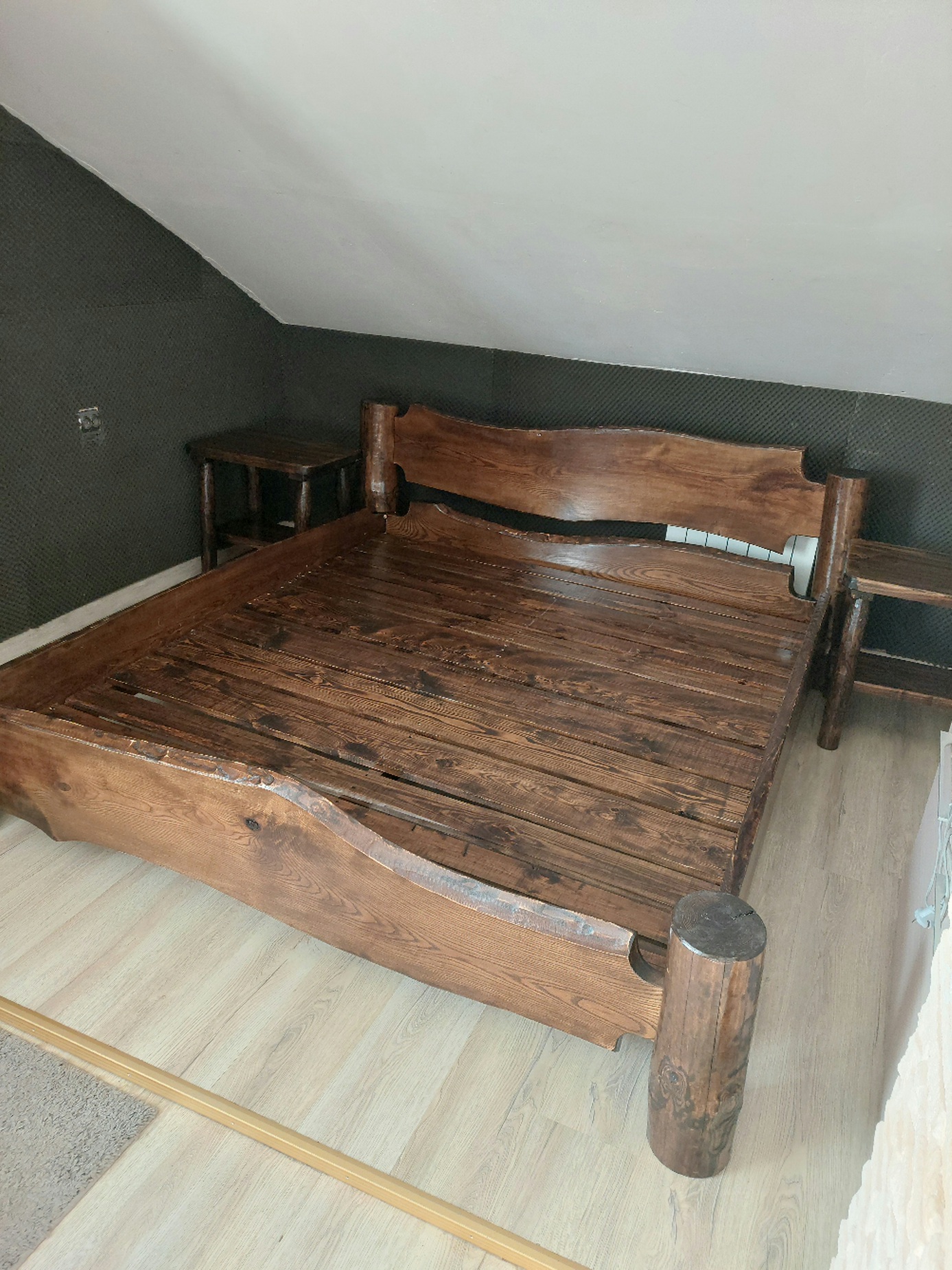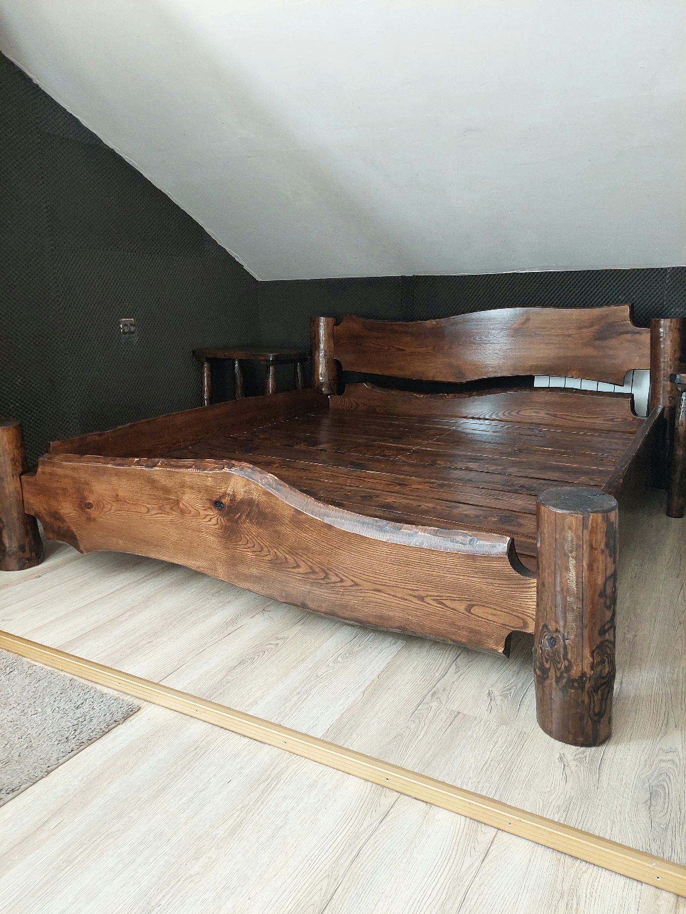 Podwójne łóżko z litego drewna lakierowane na kolor Palisander plus dwa stoliki nocne.
